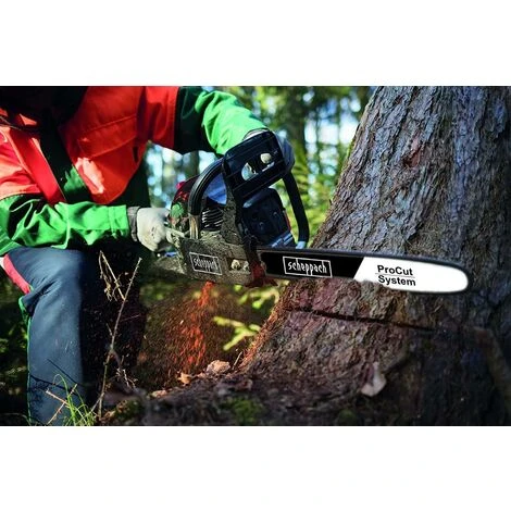 The scheppach CSH56 chain saw with its 56 cc petrol engine is the professional choice for high power.