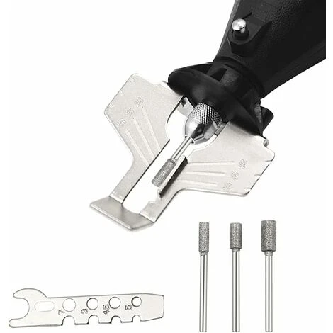 - [HIGH QUALITY AND EASY TO REPLACE BORE CHISEL] The electric chainsaw sharpening set is made of high quality material and uses pure copper core, high strength and durability. The chuck has better locking force and can be easily replaced with grinding units.