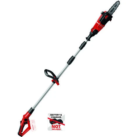 The cordless pole pruner GE-LC 18 Li T is the ideal tool for trimming hard to reach branches with ease. The OREGON-quality blade and the OREGON-chain care for clean cutting results. The 90° rotatable top piece cares for effortless horizontal cuts. To execute difficult cuts the motor head can be sloped 7-fold, and the main handle 4-fold. When needed, the chain can be tensioned and changed toolless with the practical chain tension. There is a practical cuttings sweeper included. Requires 1x 18V Einhell Power X-Change rechargeable battery.