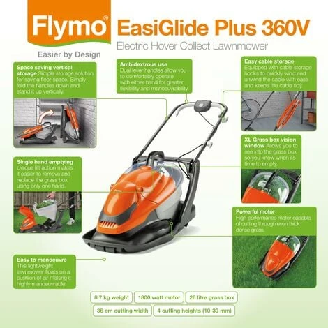 Designed for small to medium gardens, the Flymo EasiGlide Plus 360V is an electric hover lawnmower that effortlessly mows your lawn whilst floating on a cushion of air. Utilising a powerful 1800W motor and a cutting width of 36cm, so you can tackle gentle slopes and bumpy lawns with ease. Equipped with dual lever handles, an easy to empty 26L grass box, convenient cable storage, can easily fold down for storage and be wall-mounted, or can be stored vertically and is ready assembled.