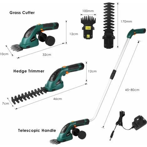 ▶Powerful and compact: the grass and shrub shear can easily treat plants up to 1.6cm. Width of the grass shear blade: 10cm, width of the shrub shear blade: 17 cm, adjustable telescopic rod: 45 to 80cm, weight: 2.15 kg.