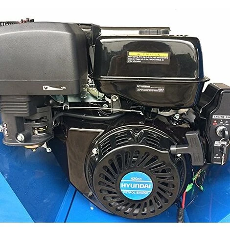 The HYCH1500E-2 is an extremely powerful and easaily transportable wood chipper from Hyundai, powered by the proven 420cc / 14hp 4-stroke OHV electric start heavy duty Hyundai engine. The HYCH1500E-2 is capable of chipping and shredding large quantities of wood and branches into easily handled chippings quickly and effortlessly. Weighing 180kg, the HYCH1500E-2 is a heavy duty machine, but is easy to manoeuvre with its twin handles, heavy duty large diameter, extra wide pneumatic tyres and using the ATV tow bar can be towed to remote locations (off road tow only). Built to make wood chipping quick and easy, the HYCH1500E-2 2 blade drum mechanism is designed to draw in and chip branches up to 10cm diameter. Thanks to the high level ejection 180 degree rotating chute, chippings can be expelled directly into a trailer, or spread over the ground, in multiple directions to suit your needs. Suitable for both domestic and professional users the HYCH1500E-2 ensures you will never struggle with back breaking and time consuming wood chipping again. With low service and maintenance requirements, the HYCH1500E-2 is very user-friendly, with easy twin v-belt tensioning, removable tow bar, toolbox, greaseable main bearings, electric start with its own 12v battery and it has full Hyundai UK parts back up. ( DELIVERY UPDATE: Please note that we offer Free Shipping to Mainland UK only! All other deliveries to any British Islands, Channel Islands, Isle of Wight, Isle of Man, Scilly Isles, the North of Scotland and Scottish Highlands & Islands will come with additional delivery charges. Due to circumstances beyond our control, we’re unfortunately now no longer able to deliver to residential addresses in Northern Ireland & Ireland)