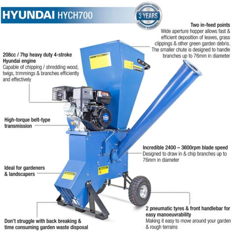 The Hyundai HYCH700 is a compact wood chipper, powered by a 208cc / 7hp OHV 4-stroke unleaded petrol Hyundai engine, the HYCH700 is capable of chipping / shredding wood, twigs, trimmings and branches efficiently and effectively. This garden chipper/shredder transforms piles of garden waste into manageable compostable material effortlessly.