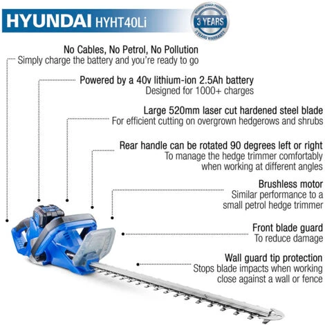 Hyundai HYHT40Li 40V Cordless Hedge Trimmer with 1x 2.5Ah Battery