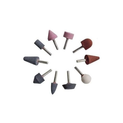 Rotary Grinding Stones Suitable for general purpose grinding and deburring for use on most metals. Comprising 10 Assorted Shapes and sizes. Manufactured From Aluminium Oxide. 50 assorted pieces to suit different applications: including Mild Steel, Cast Iron, Stainless-Steel, High-Speed Steel, Non-Ferrous Metals and Alloys, Stone and Plastics
