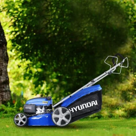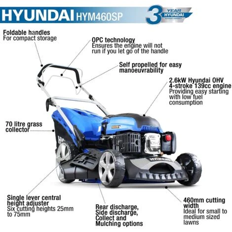 The Hyundai HYM460SP 18″ self-propelled lawn mower is a rear wheel drive, self-propelled mower, powered by an economical Hyundai 139cc OHV 4-stroke low emission petrol engine. It has been designed to offer you great features at an amazing price and gives you the choice of four different ways to deal with your grass cuttings: collection, rear discharge, side discharge and mulching. With tool-free assembly, you can be up and running in minutes. With a cutting width of 46cm, it is ideal for medium size lawns. The cutting height is easily adjustable to seven different positions from 25mm to 75mm all from a single wheel height adjustment lever. The engine is easily started thanks to the CDI ignition system and the drive to the rear wheels is controlled from the rear mounted handle control. The fully enclosed drive belt can be easily accessed through the new removable maintenance cover. With the added benefit of extra large self-drive wheels, the HYM460SP is easily manoeuvrable in overgrown grass and uneven areas. For added convenience this lawn mower is equipped with a large 70 litre capacity fabric and plastic grass box and comes fitted with a useful full-bag indicator to tell you when the box needs emptying, so you won’t need to stop and check. The fabric material also helps airflow which improves collection of grass cuttings. Fitted with a solid steel deck which offers extra strength, extends the life of the mower and also results in a higher quality feel. The deck can also be easily cleaned thanks to its fitted garden hose connection. The soft grip handles can be folded down, making for easy storage and transportation of the lawnmower. Comes with mulching plug and side discharge chute. Fitted with a hard wearing steel deck for extended long life. IN THE BOX: HYM460SP Petrol Lawnmower, 70L Polyester Grass Bag and User Manual ( DELIVERY UPDATE: Please note that we offer Free Shipping to Mainland UK only! All other deliveries to any British Islands, Channel Islands, Isle of Wight, Isle of Man, Scilly Isles, the North of Scotland and Scottish Highlands & Islands will come with additional delivery charges. Due to circumstances beyond our control, we’re unfortunately now no longer able to deliver to residential addresses in Northern Ireland & Ireland)