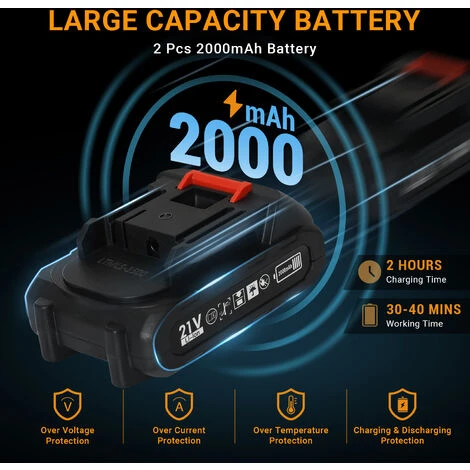 - Large Capacity Battery – Mini chainsaw with two 21V 2000mAH rechargeable lithium ion batteries,super battery life can support you to cut multiple trees in succession.The chainsaw takes only 1-2 hours to fully charge,and then runs continuously for up to 30-60 minutes.